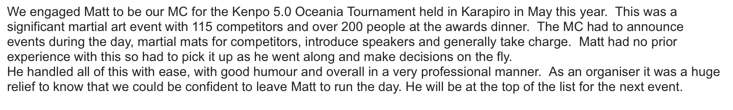 I’ve hosted the Hautapu rugby club fundraiser ‘Miss Hautapu’ (if you can run that event you can run anything) for the last couple of years as well as the Oceania Kenpo 5.0 championship 2017, Brian Wellington Hospice Waikato fundraiser, Leamington Rugby Club 7s, The Stables Vibes event as well as the St Peters Cambridge parents association fundraiser evening.
