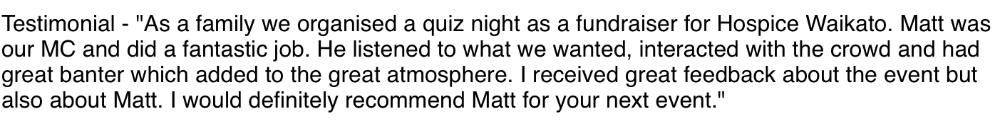 I keep my MCing teeth sharp with a weekly Quiz night hostings at Boundary Restaurant and Bar Tamahere (Mondays), Lucky Finns Hamilton (Tuesday) Clubhouse Cambridge (Wednesday) and Stallions Te Awamutu (Thursday) and also the regular monthly St Kilda Bistro Quiz night . I have been hosting Quizzes for various pubs/organisations (The Five Stags, Horse and Jockey, Pilot Brewery, Waikato University and Hora Hora Hall ) for the past 11 years now and it has taught me most importantly about the importance of crowd participation, clarity of instruction and keeping the flow of an event tight and timely. Overall the most important part of being a host is making people feel welcome and comfortable. If you need someone to host your event don't hesitate to get in touch.
