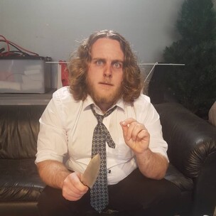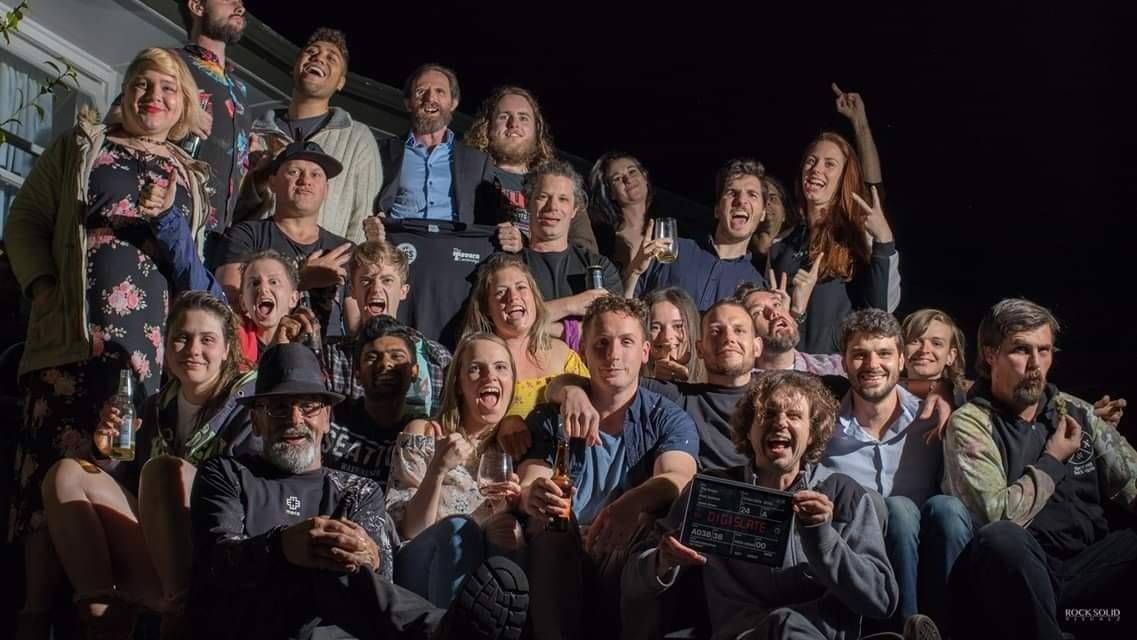 Cast members Creed Fletcher, Sarah Price and Thomas Burgone-Smith posing between takes.