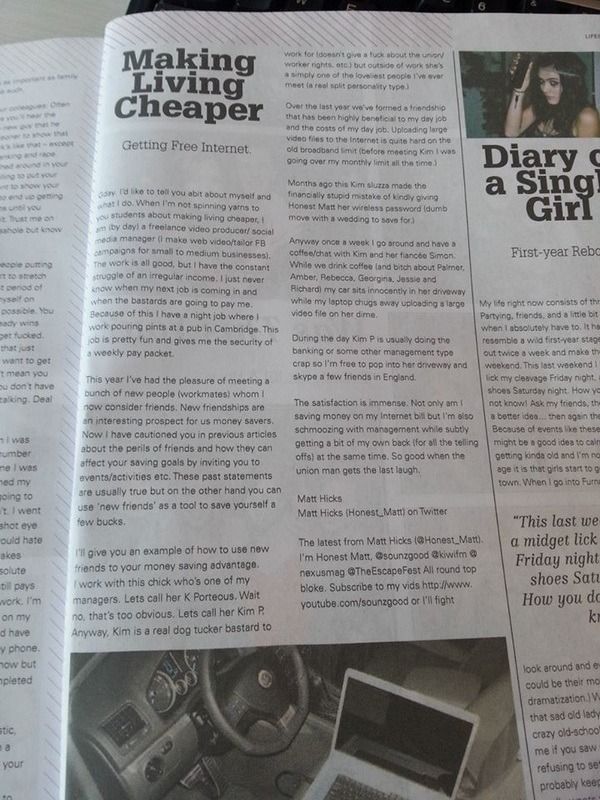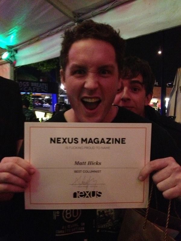 Writing has always been another massive passion of mine. I have written many articles for both SouNZgood.co.nz and Nexus Magazine. Highlights of my writing career include being nominated for 'Humorist of the year' at the 2011 Aotearoa Student Press Association awards in my first year of writing and in 2013 taking out 'Best Columnist' at the Waikato University clubs awards.